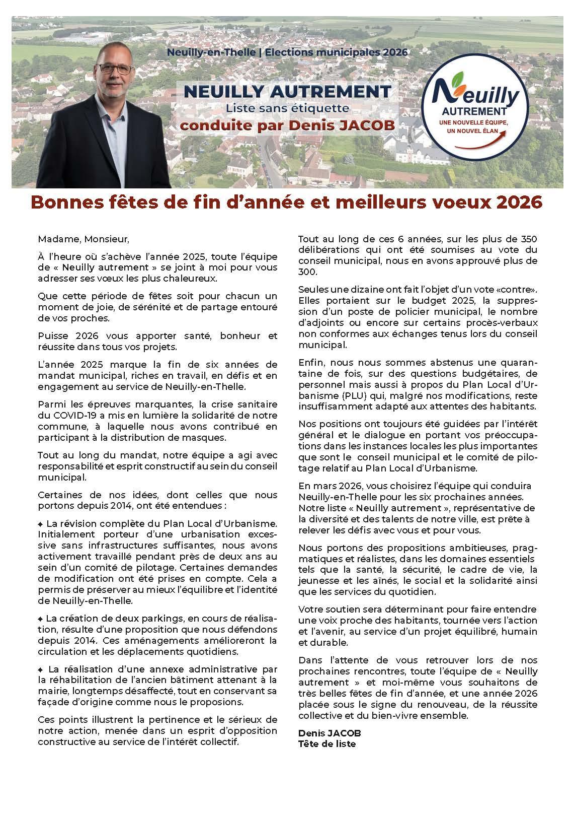 Enfin, cette lettre se projette vers l’avenir. En mars 2026, les élections municipales permettront de choisir l’équipe qui conduira Neuilly-en-Thelle pour les six prochaines années. Nous y présentons notre démarche, notre équipe et les grandes orientations de notre programme pour 2026, dans des domaines essentiels comme la santé, la sécurité, le cadre de vie, la solidarité et les services du quotidien.